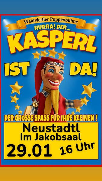 Waldviertler Puppenbühne Hurra! Der Kasperl kommt am 29.01.2026 um 16 Uhr Der Kasperl kommt am 29.01.2026 um 16:00 Uhr nach Neustadtl in den Jakobsaal. mehr: Hurra! Der Kasperl kommt am 29.01.2026 um 16 Uhr