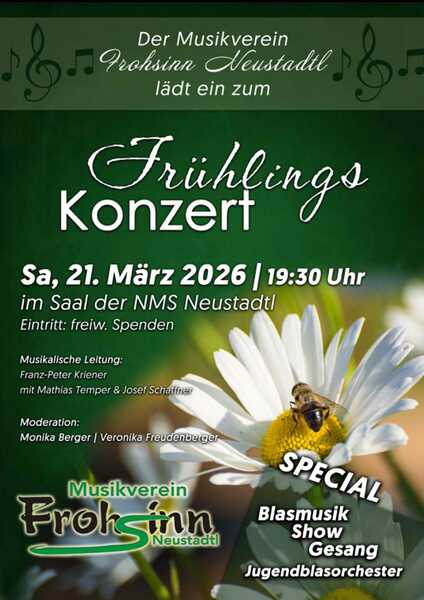 Einladung zum Frühlingskonzert Herzliche Einladung zum Frühlingskonzert am 21.03.2026 um 19:30 Uhr im Saal der NMS Neustadtl. mehr: Frühlingskonzert