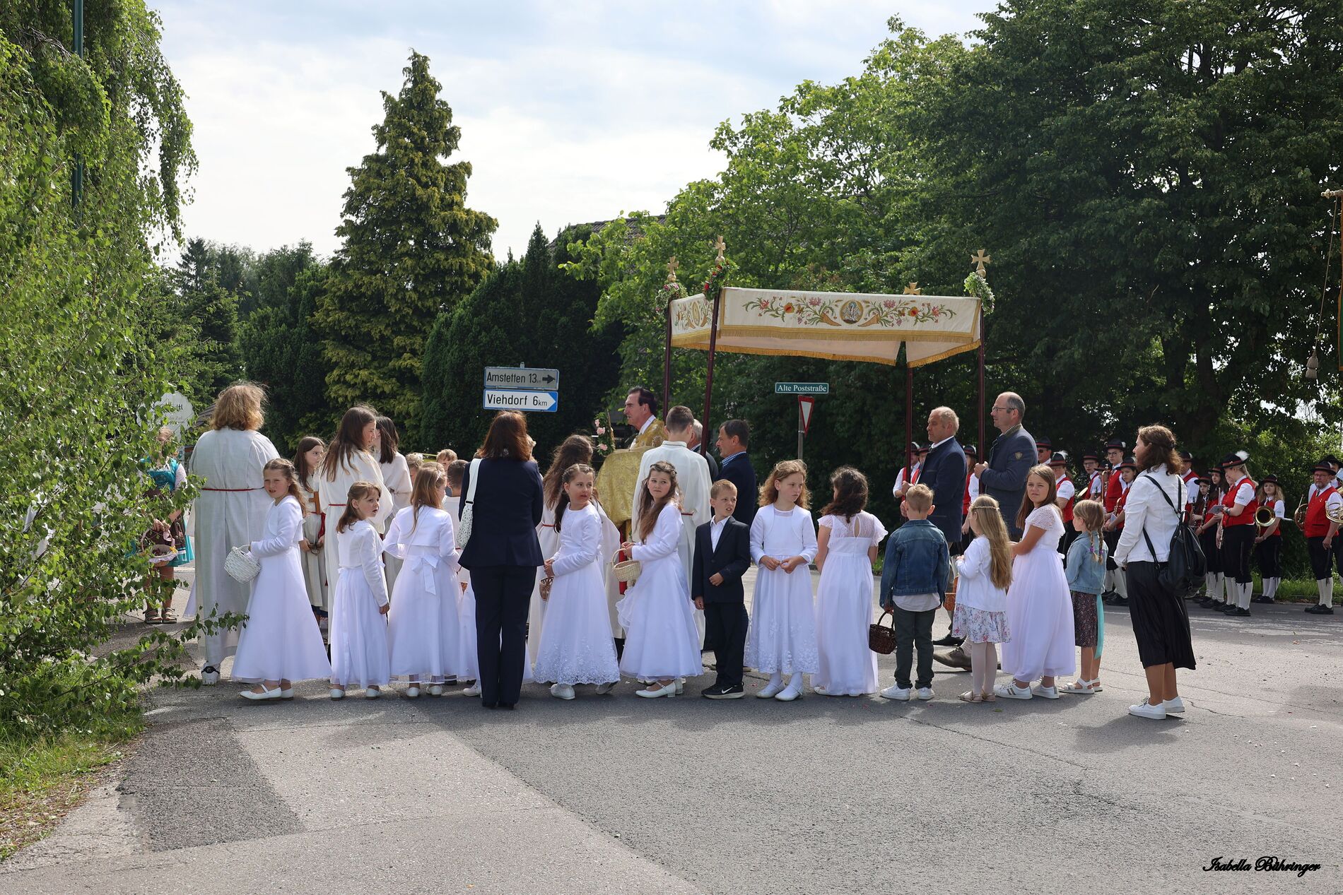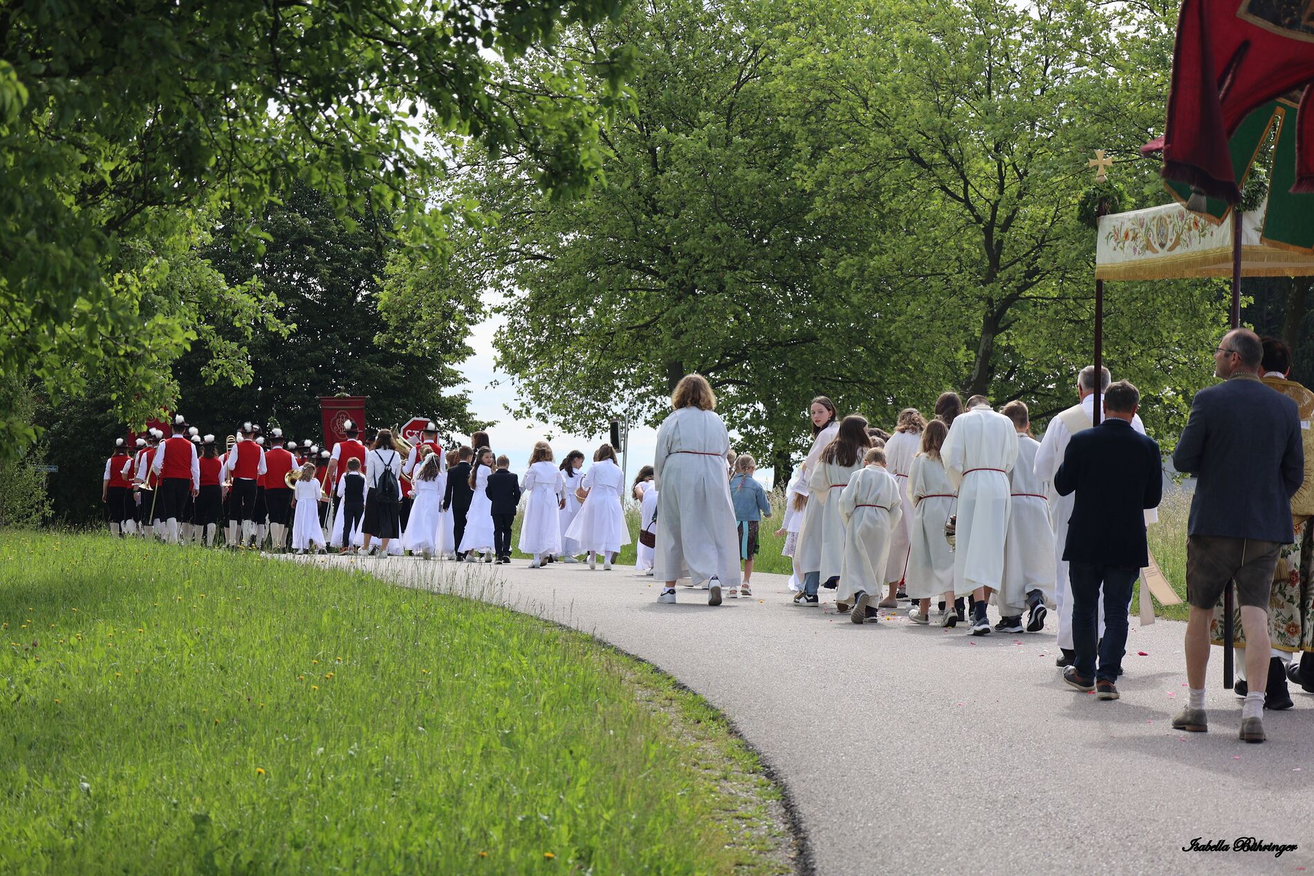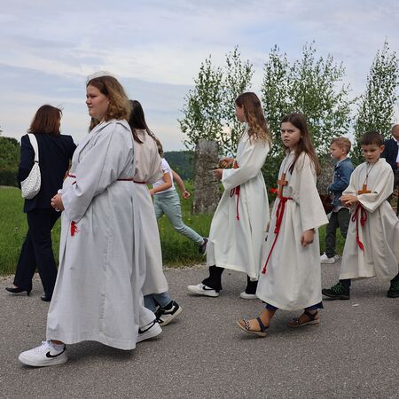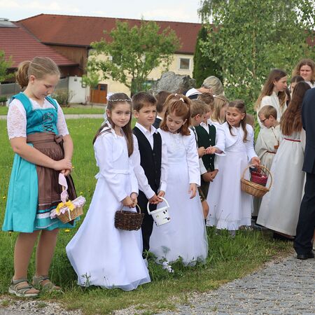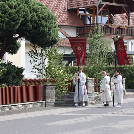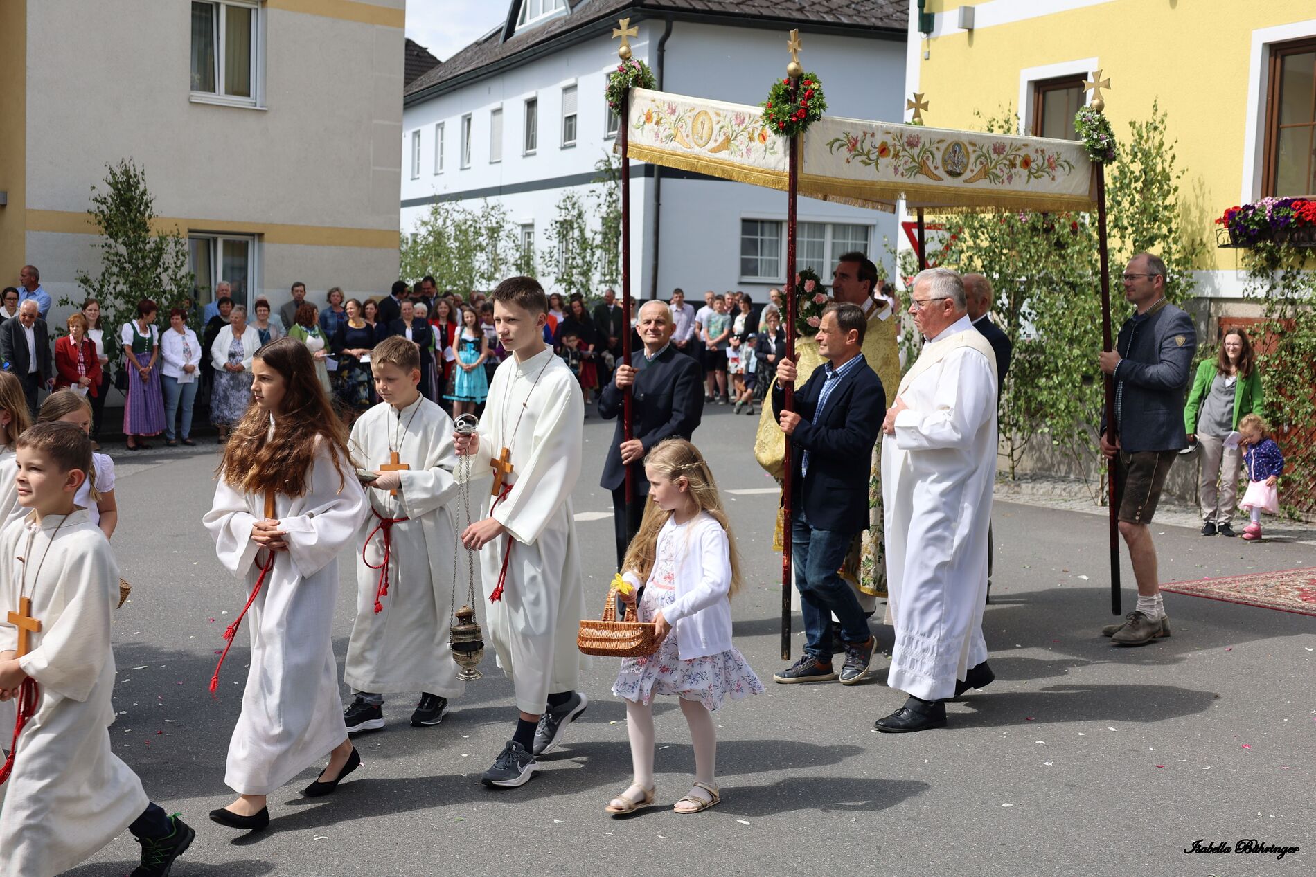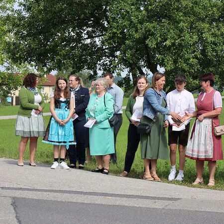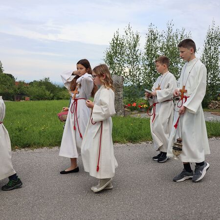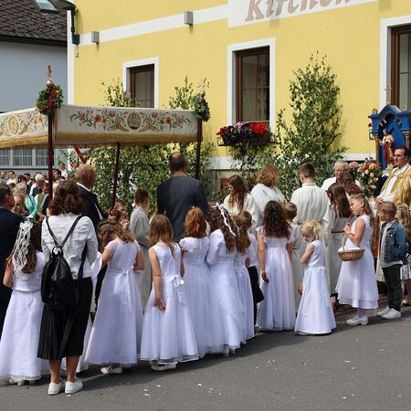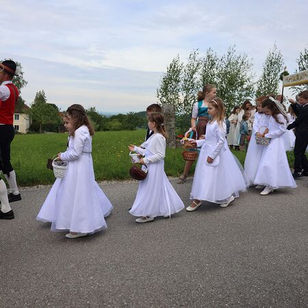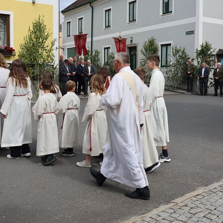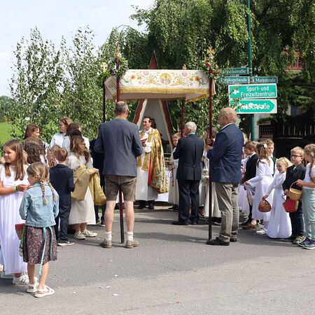 In einem feierlichen Zug gingen Ministranten mit Fahnen und Kreuz, die Musikkapelle, die Erstkommunionkinder, die Ministranten, Herr Diakon Kranzl, der Herr Pfarrer mit der Monstranz und die Gläubigen durch den Ort zu vier Altären.