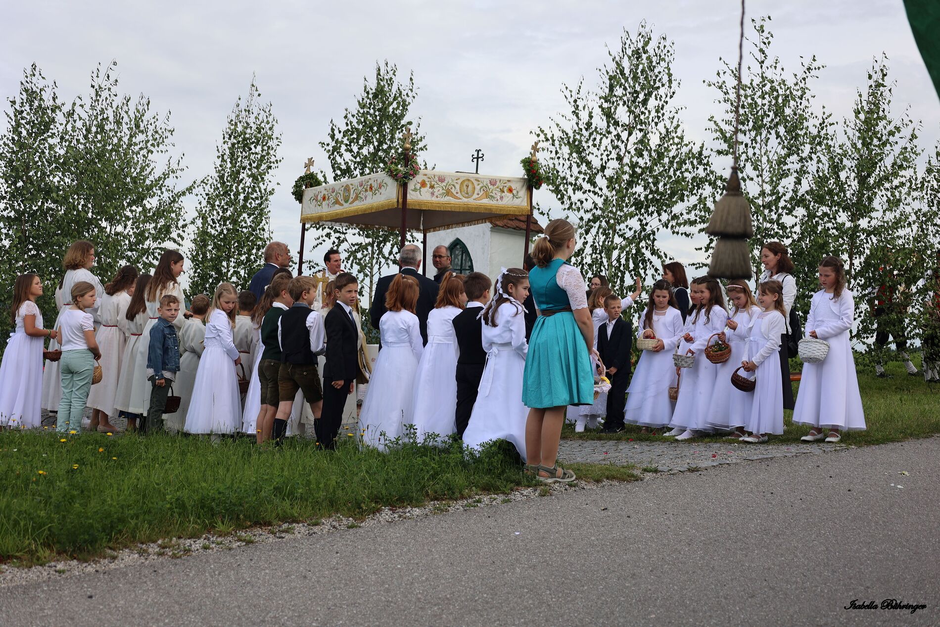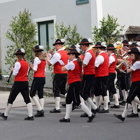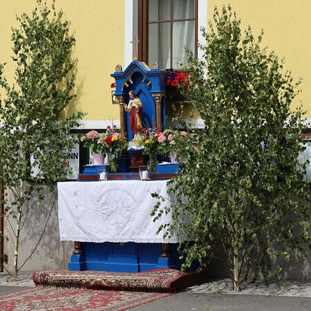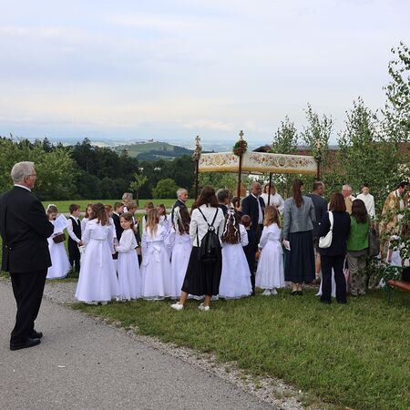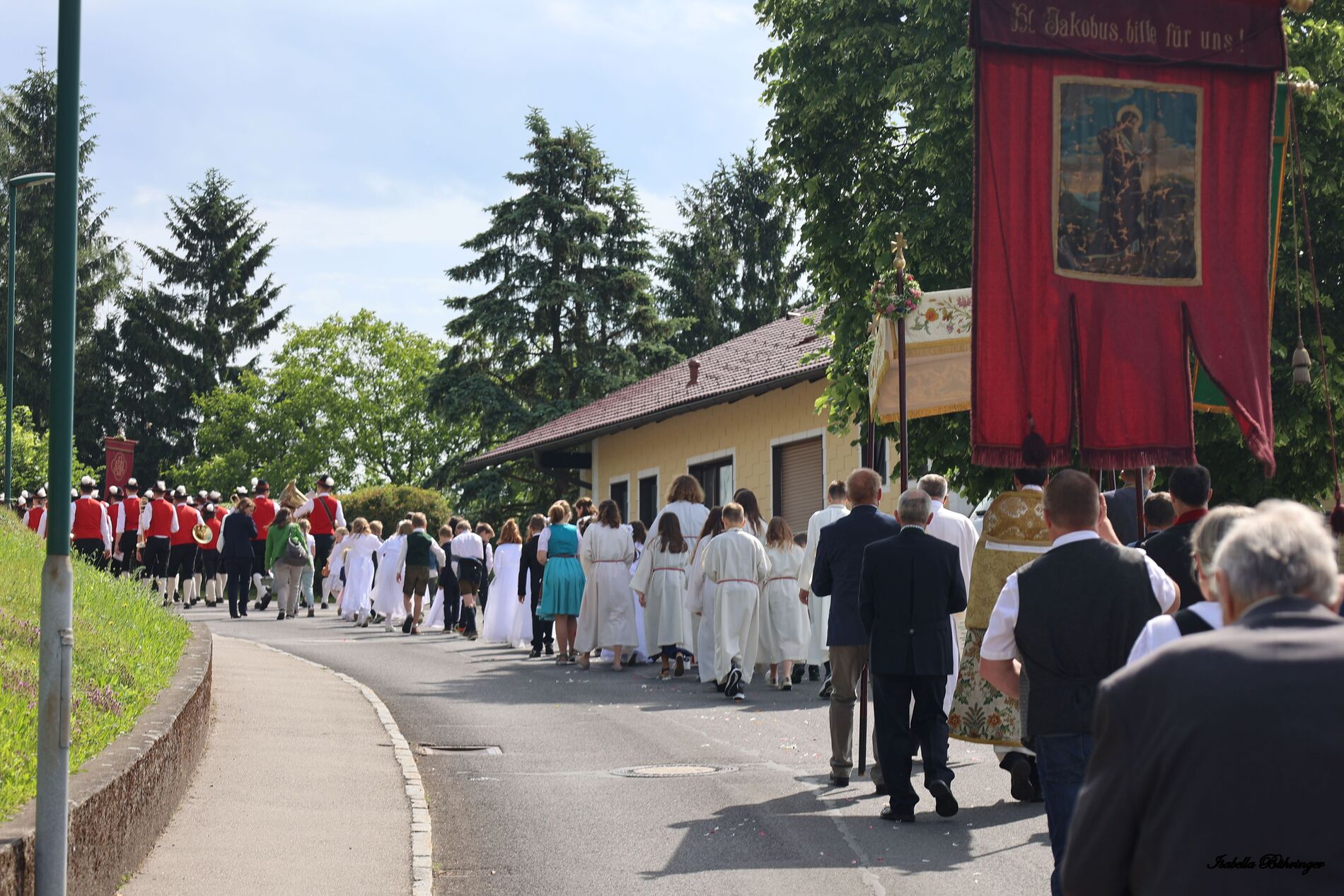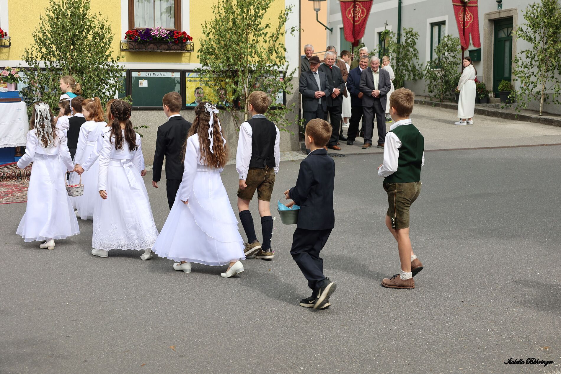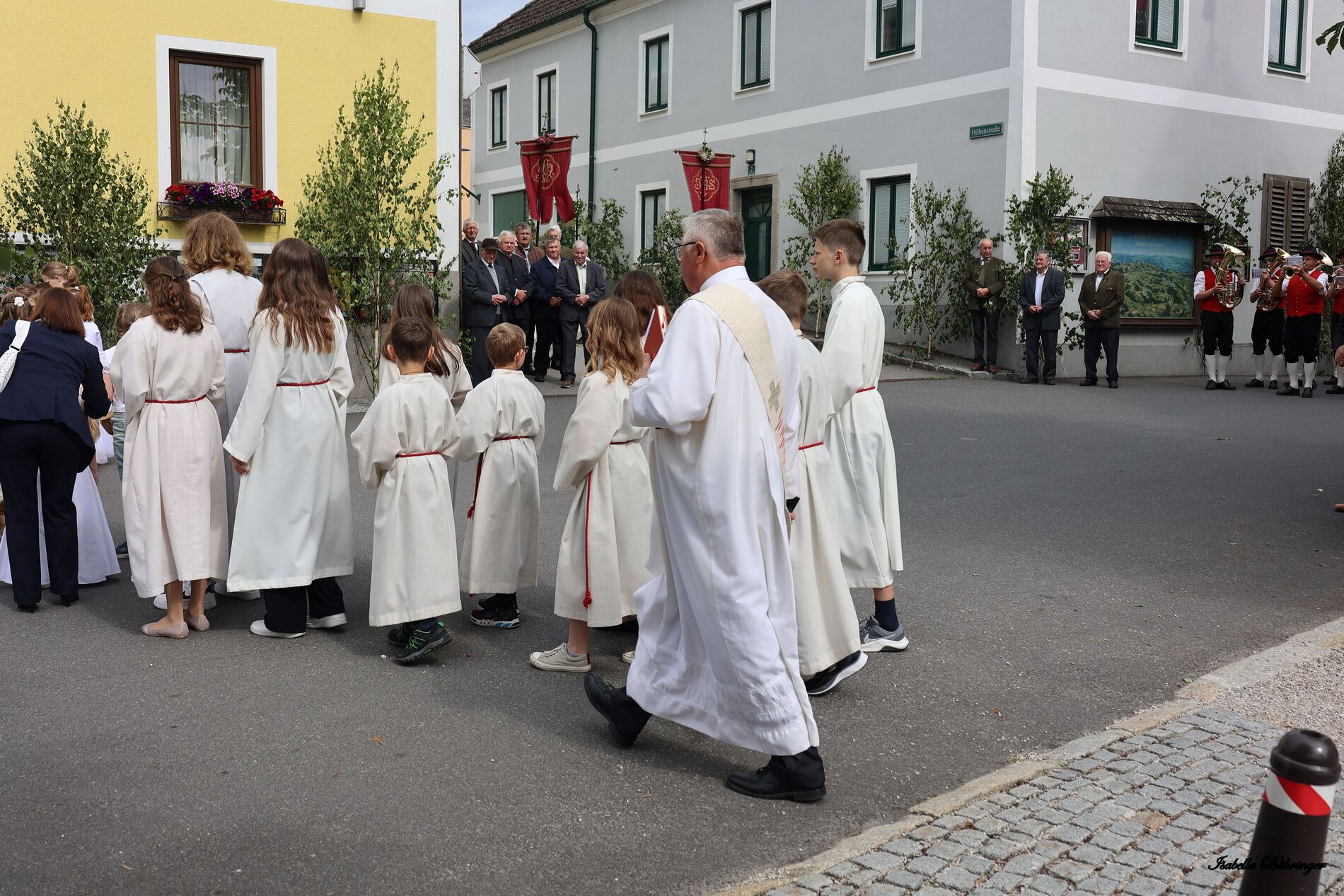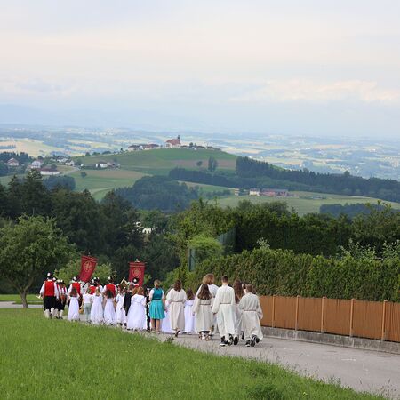 In einem feierlichen Zug gingen Ministranten mit Fahnen und Kreuz, die Musikkapelle, die Erstkommunionkinder, die Ministranten, Herr Diakon Kranzl, der Herr Pfarrer mit der Monstranz und die Gläubigen durch den Ort zu vier Altären.