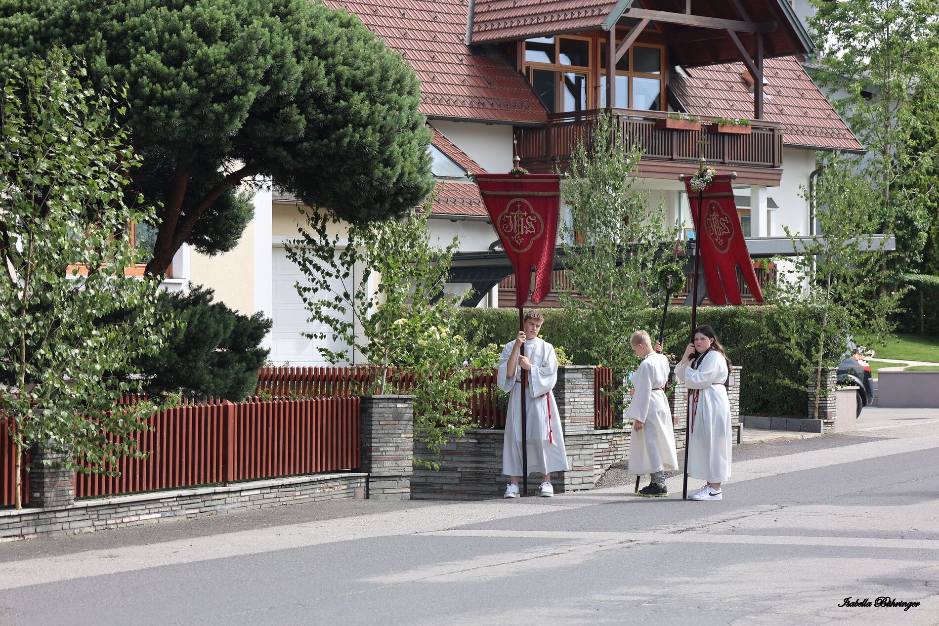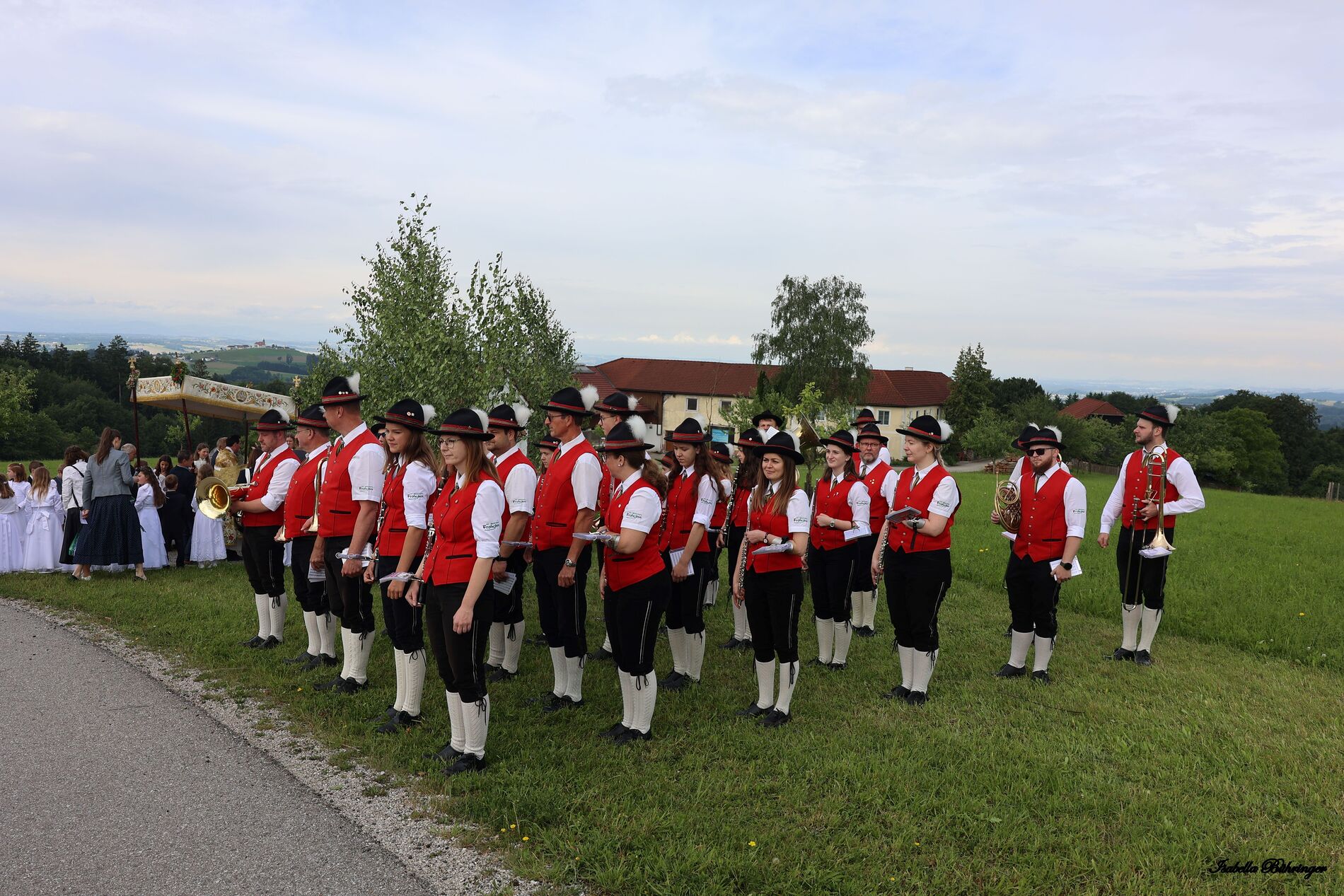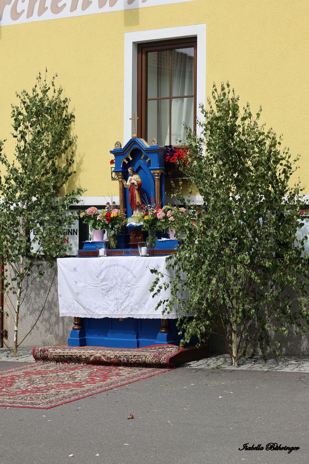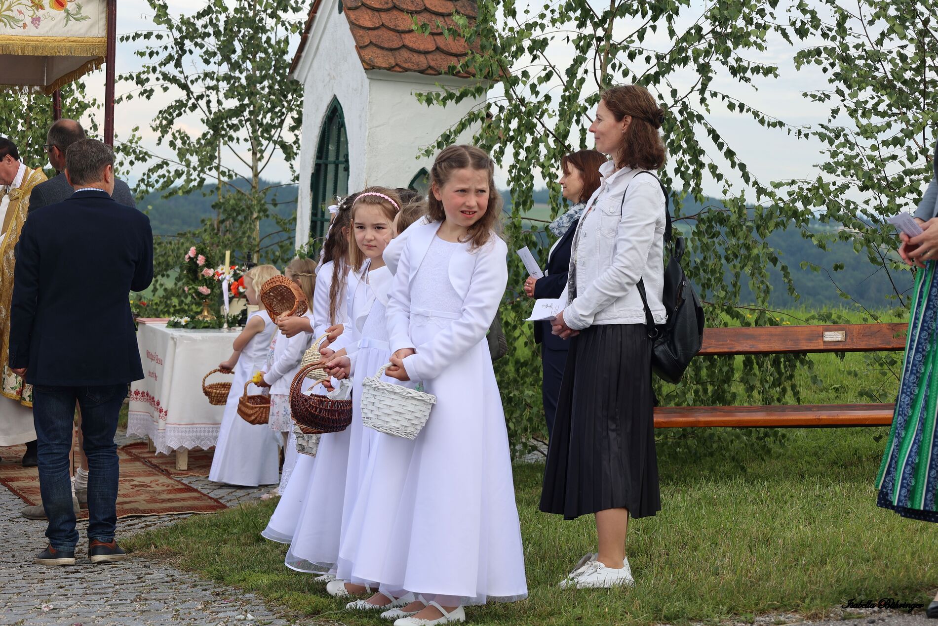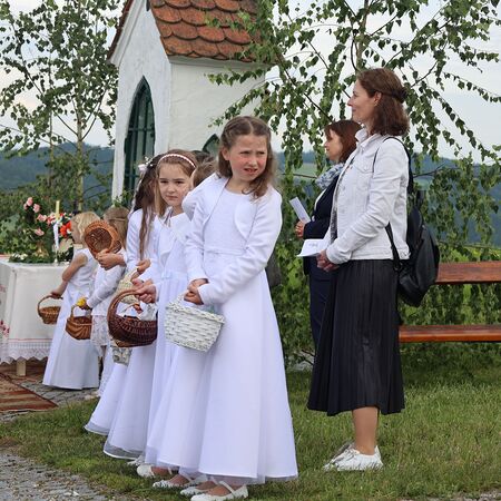 In einem feierlichen Zug gingen Ministranten mit Fahnen und Kreuz, die Musikkapelle, die Erstkommunionkinder, die Ministranten, Herr Diakon Kranzl, der Herr Pfarrer mit der Monstranz und die Gläubigen durch den Ort zu vier Altären.