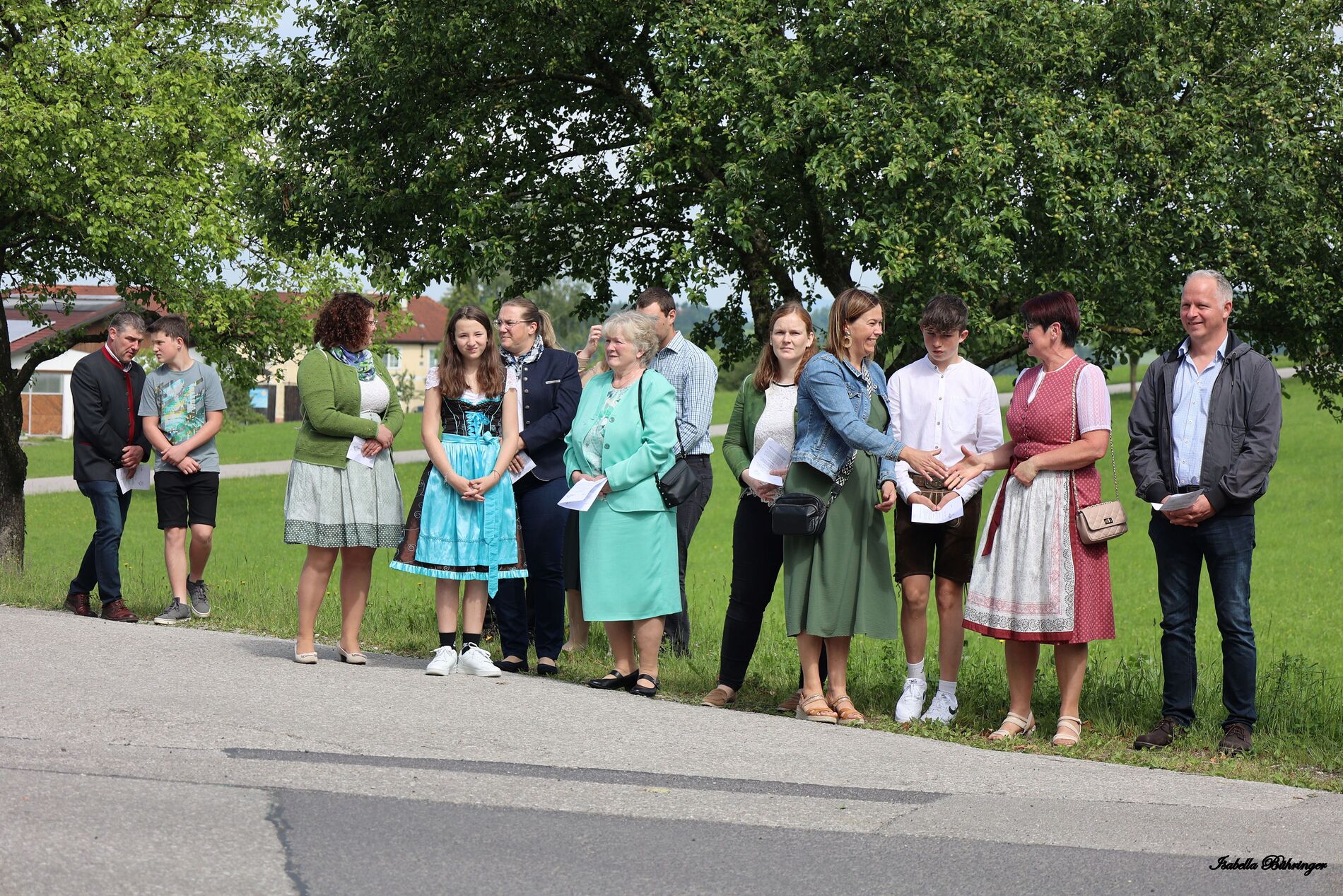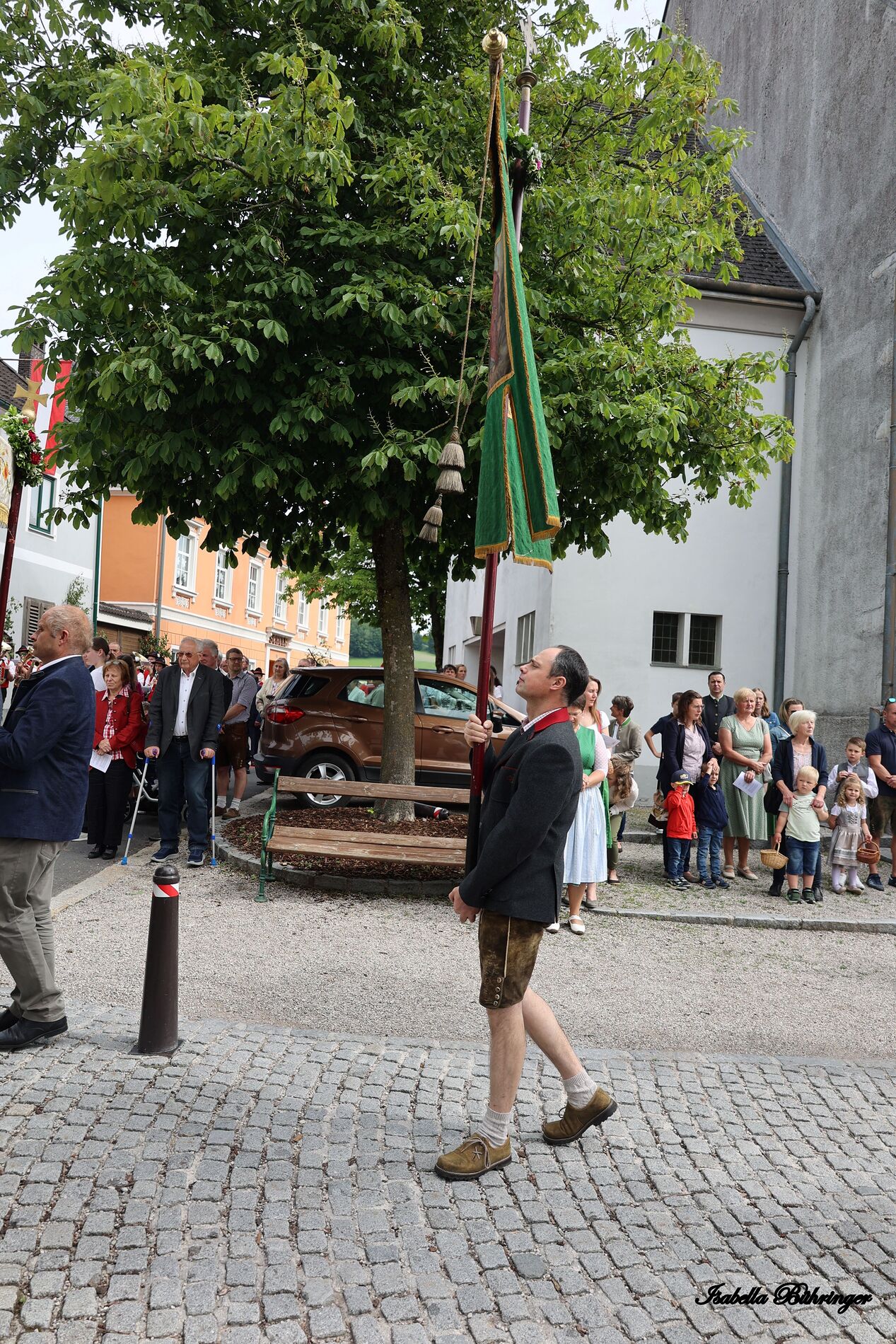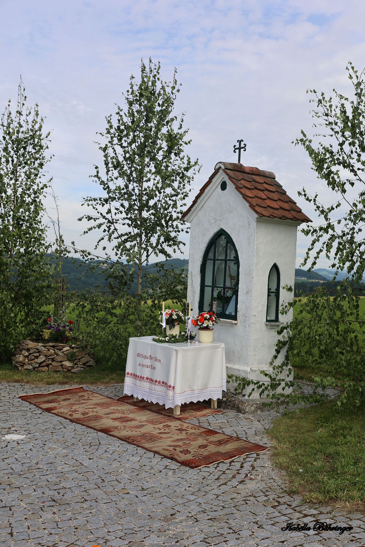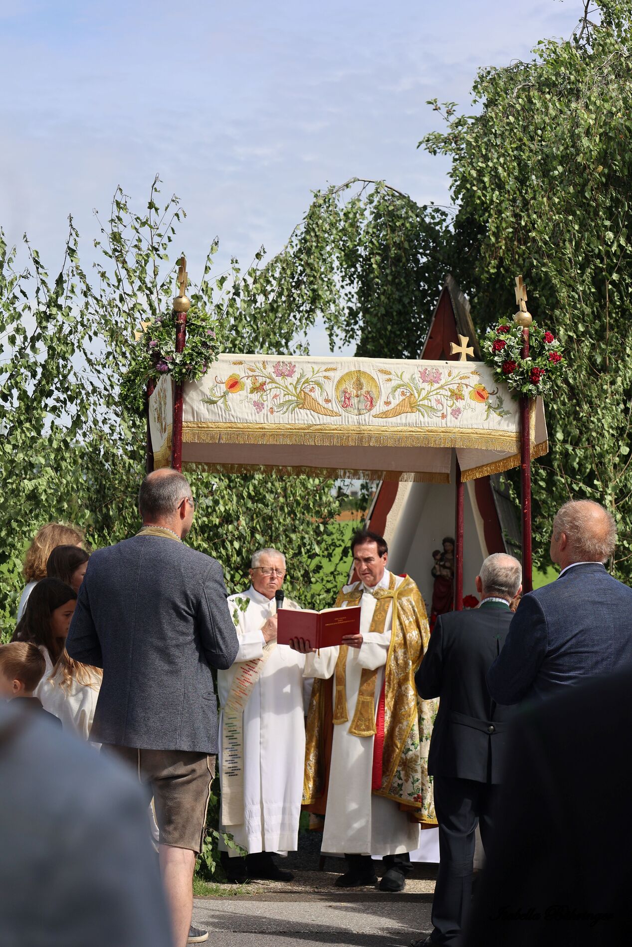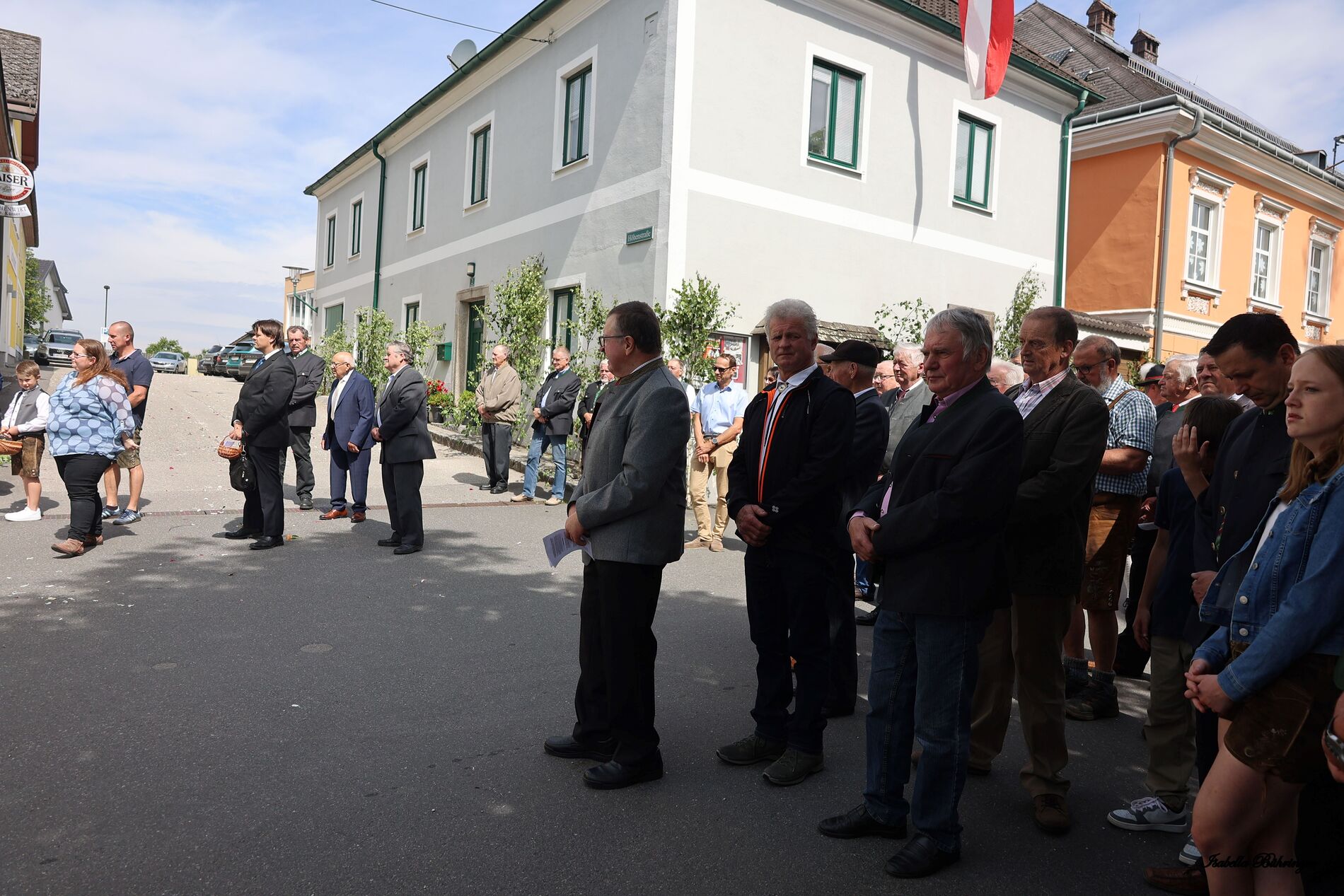 In einem feierlichen Zug gingen Ministranten mit Fahnen und Kreuz, die Musikkapelle, die Erstkommunionkinder, die Ministranten, Herr Diakon Kranzl, der Herr Pfarrer mit der Monstranz und die Gläubigen durch den Ort zu vier Altären.