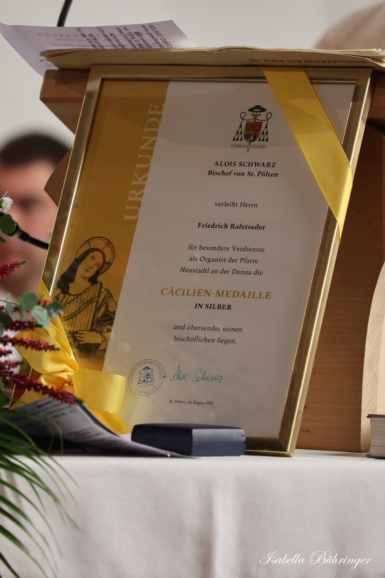 Am Erntedanksonntag wurde Herrn Friedrich Rafetseder für besondere Verdienste als Organist die Cäcilien-Medaille in Silber verliehen.