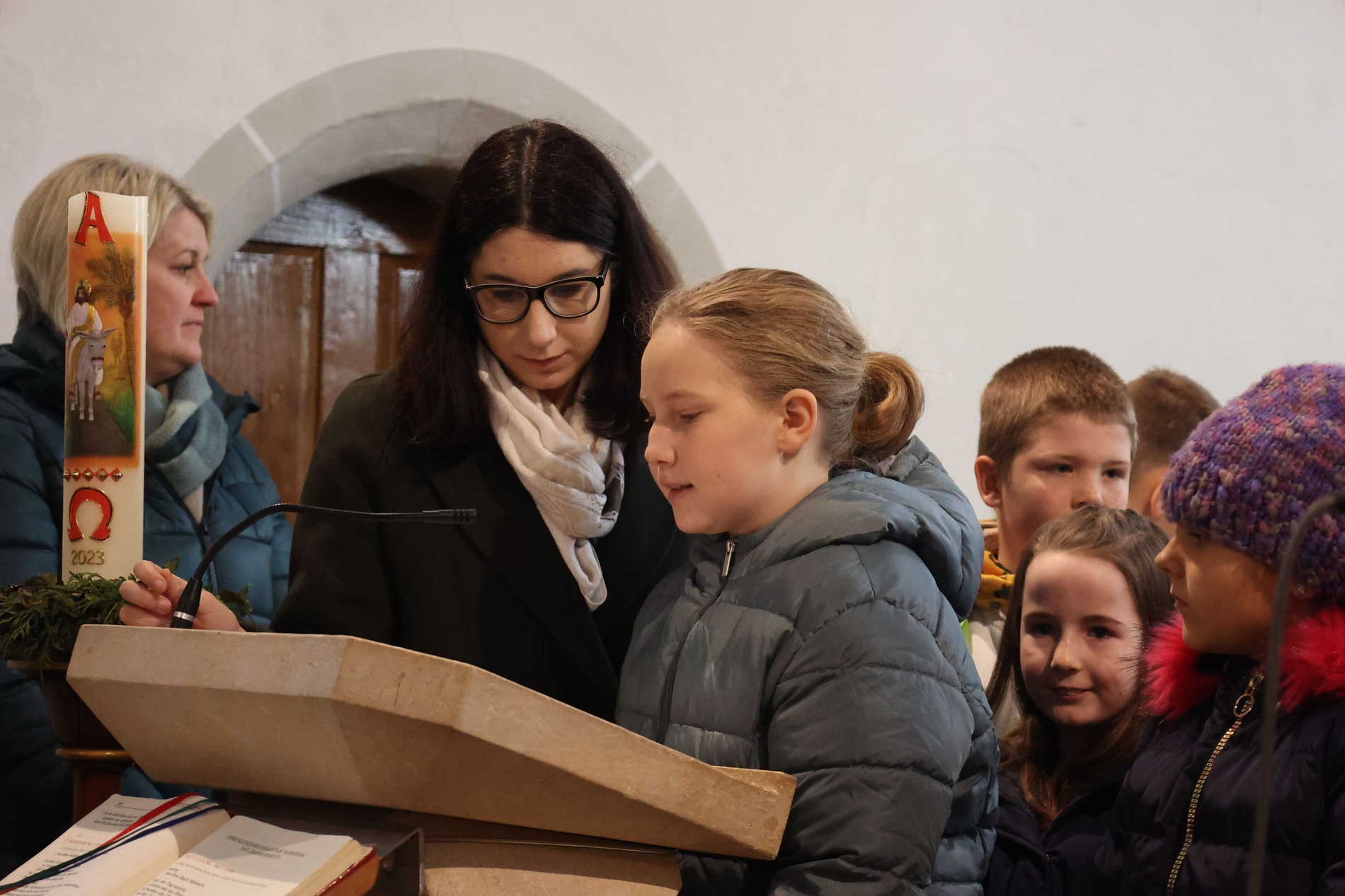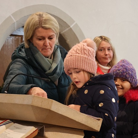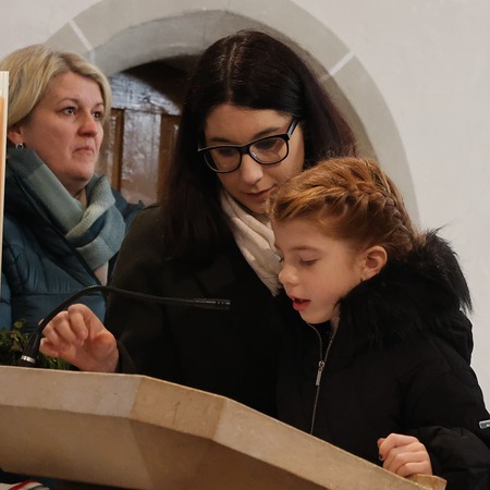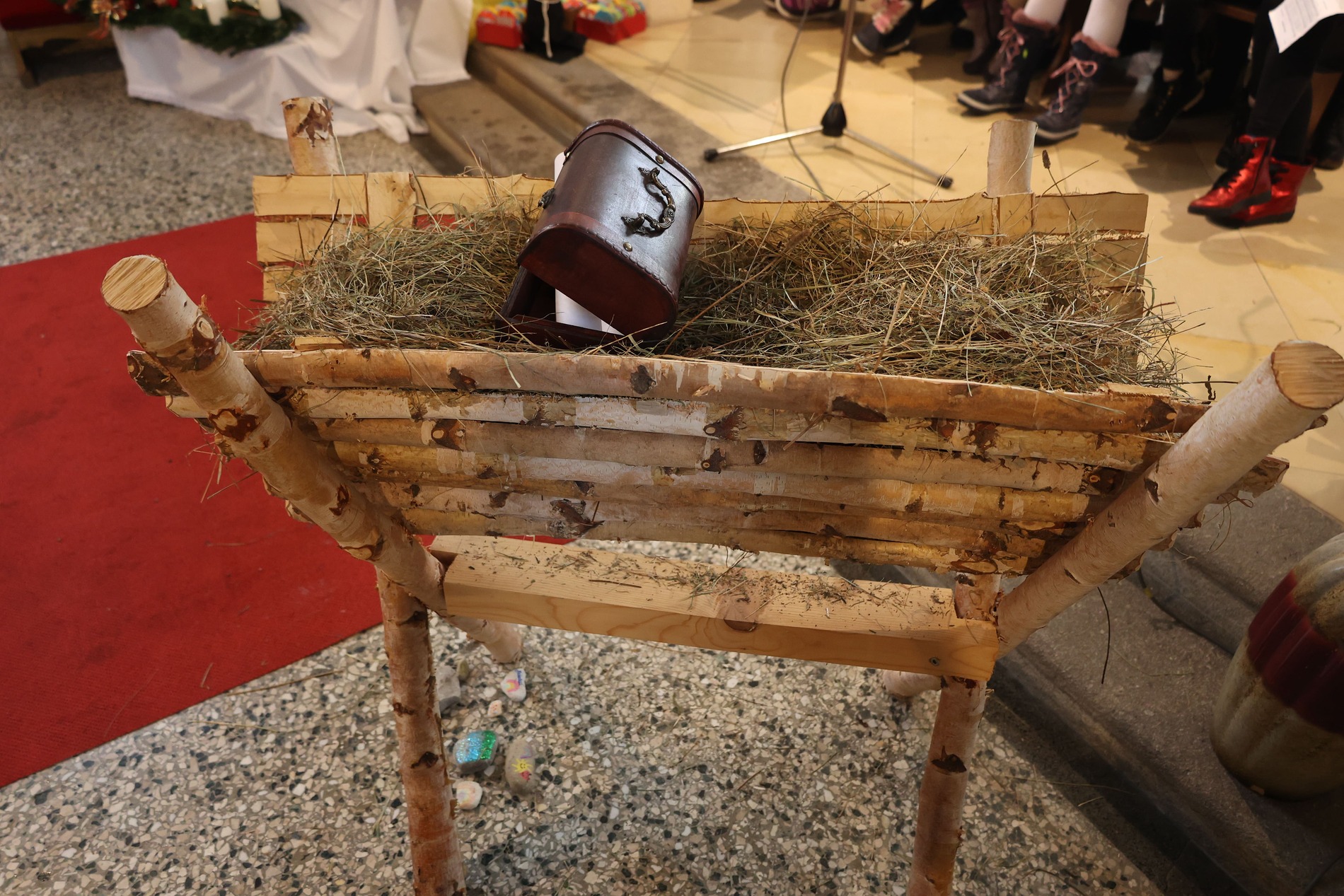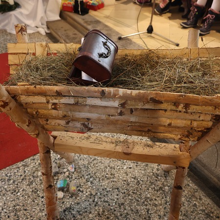Als Zeichen dafür bringen die Kinder dann etwas zur Kirche mit: Friedenssteine, Zweige, geschmückte Zapfen, …. . Die Aufgaben finden die Kinder in der Schatztruhe in unserer noch leeren Krippe vorne beim Altar.