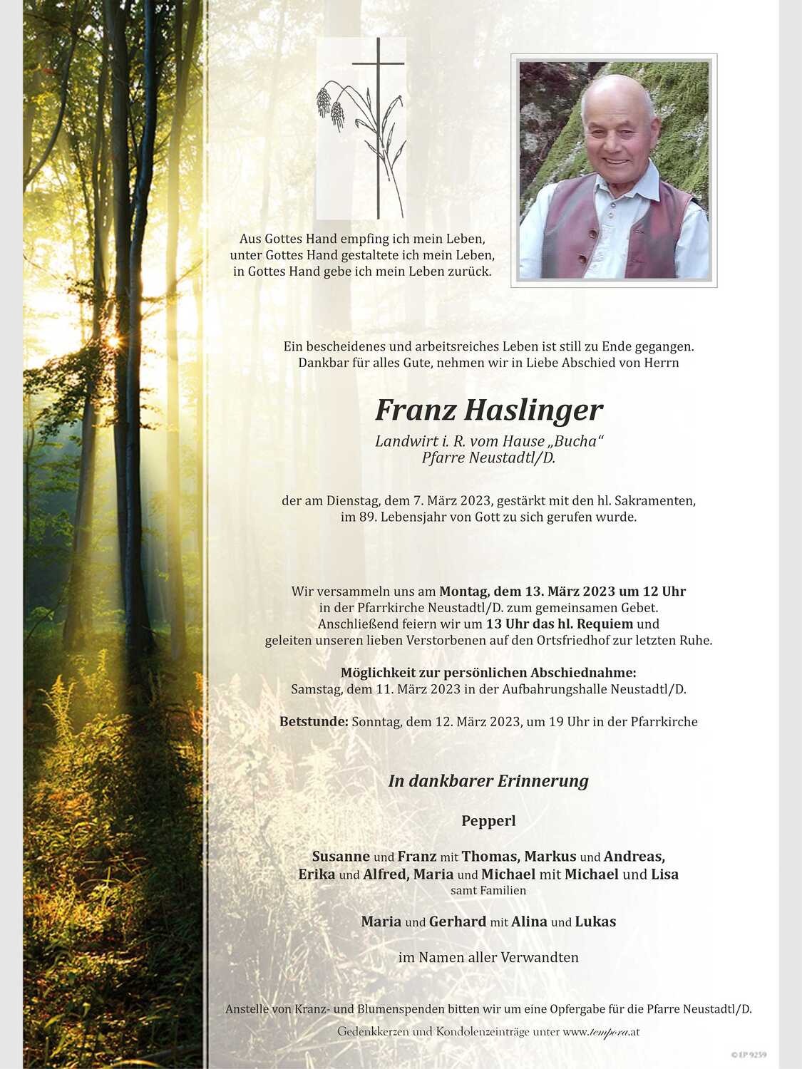 Franz Haslinger, verst. 07.03.2023 im 89. Lebensjahr - Parte