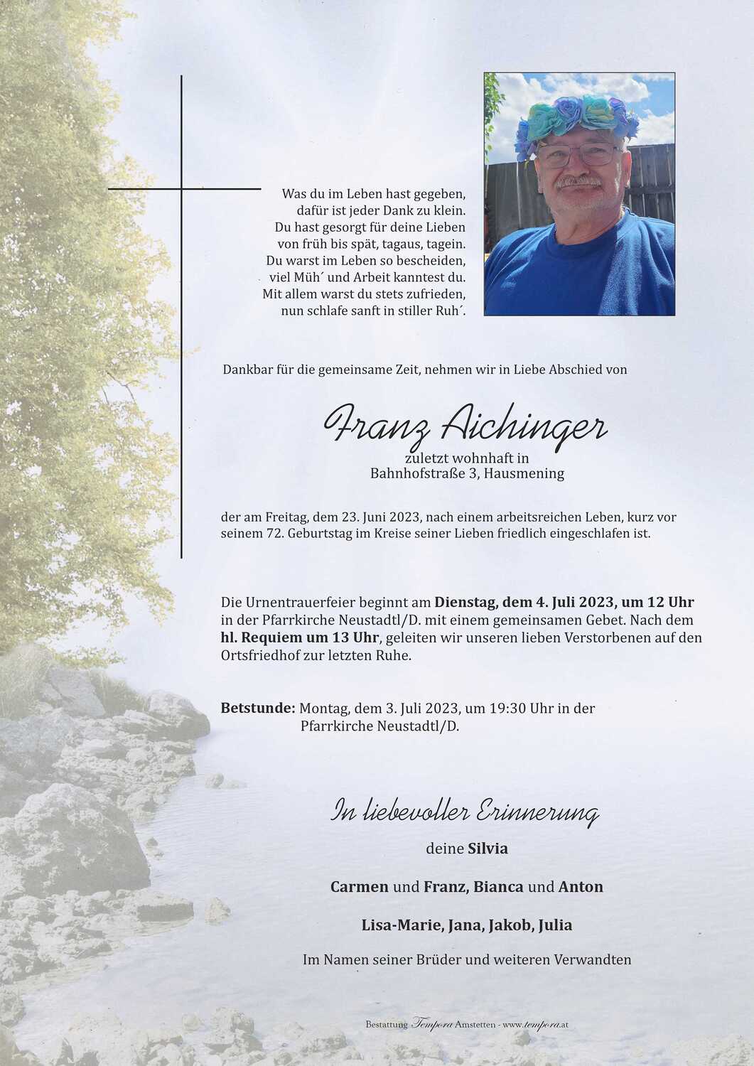 Franz Aichinger, verst. 23.06.2023 im 72. Lebensjahr - Parte
