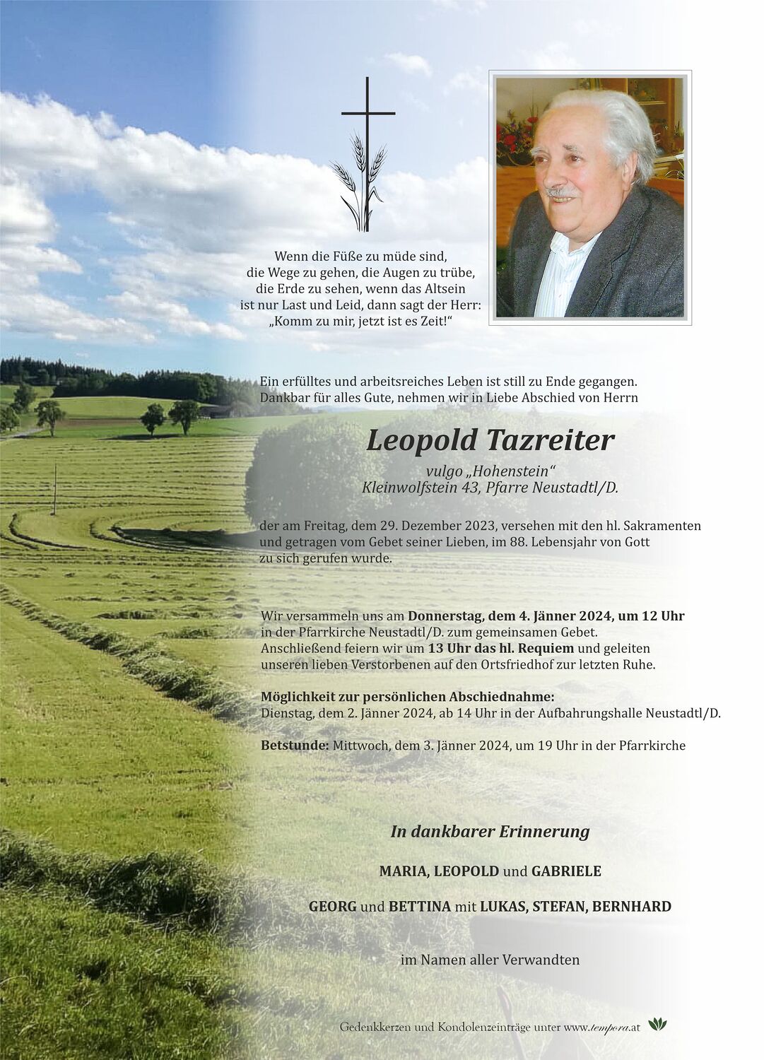 Leopold Tazreiter, verst. 29.12.2023 im 88. Lebensjahr - Parte