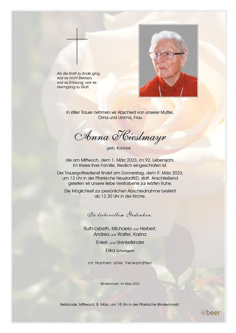 Anna Hieslmayr, verst. 01.03.2023 im 92. Lebensjahr - Parte