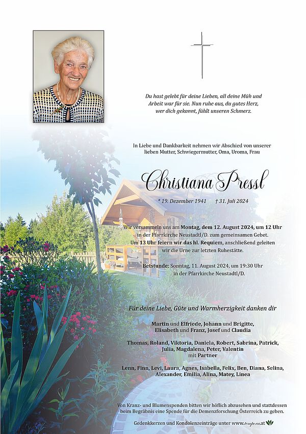 Christiana Pressl, verst. 31.07.2024 im 83. Lebensjahr - Parte