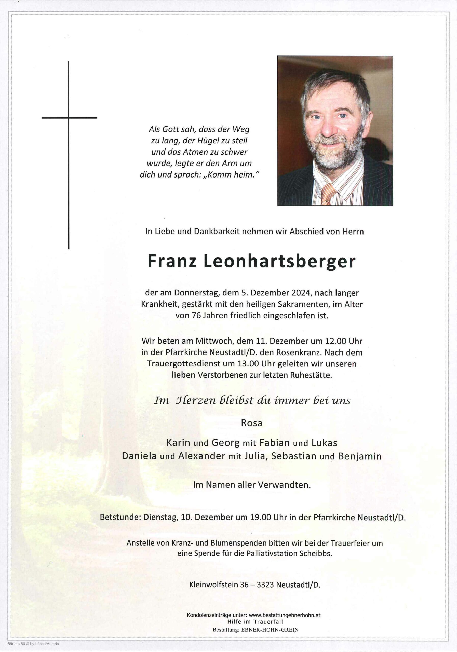 Franz Leonhartsberger, verst. 05.12.2024 im 76. Lebensjahr - Parte