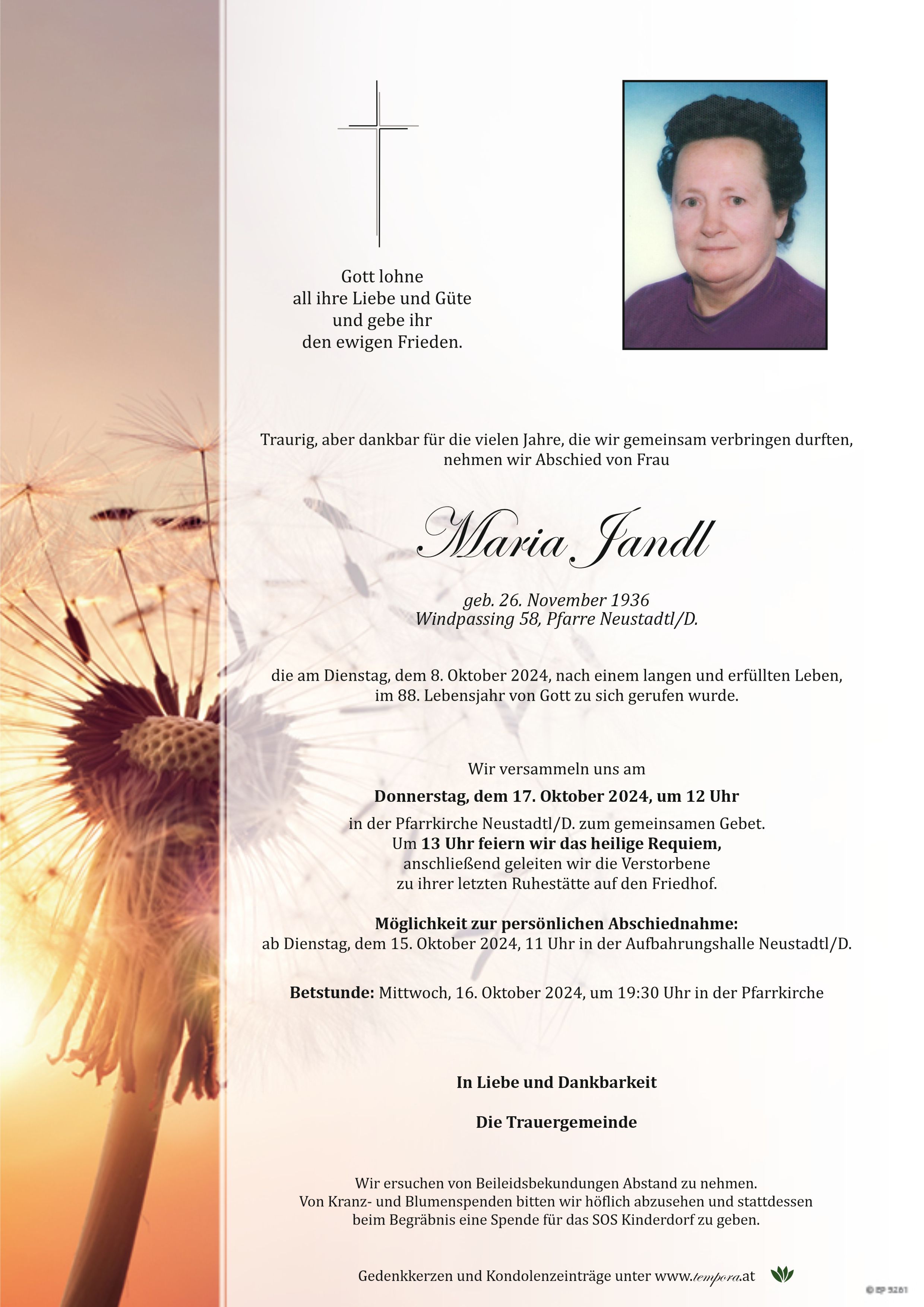 Maria Jandl, verst. 08.10.2024 im 88. Lebensjahr - Parte