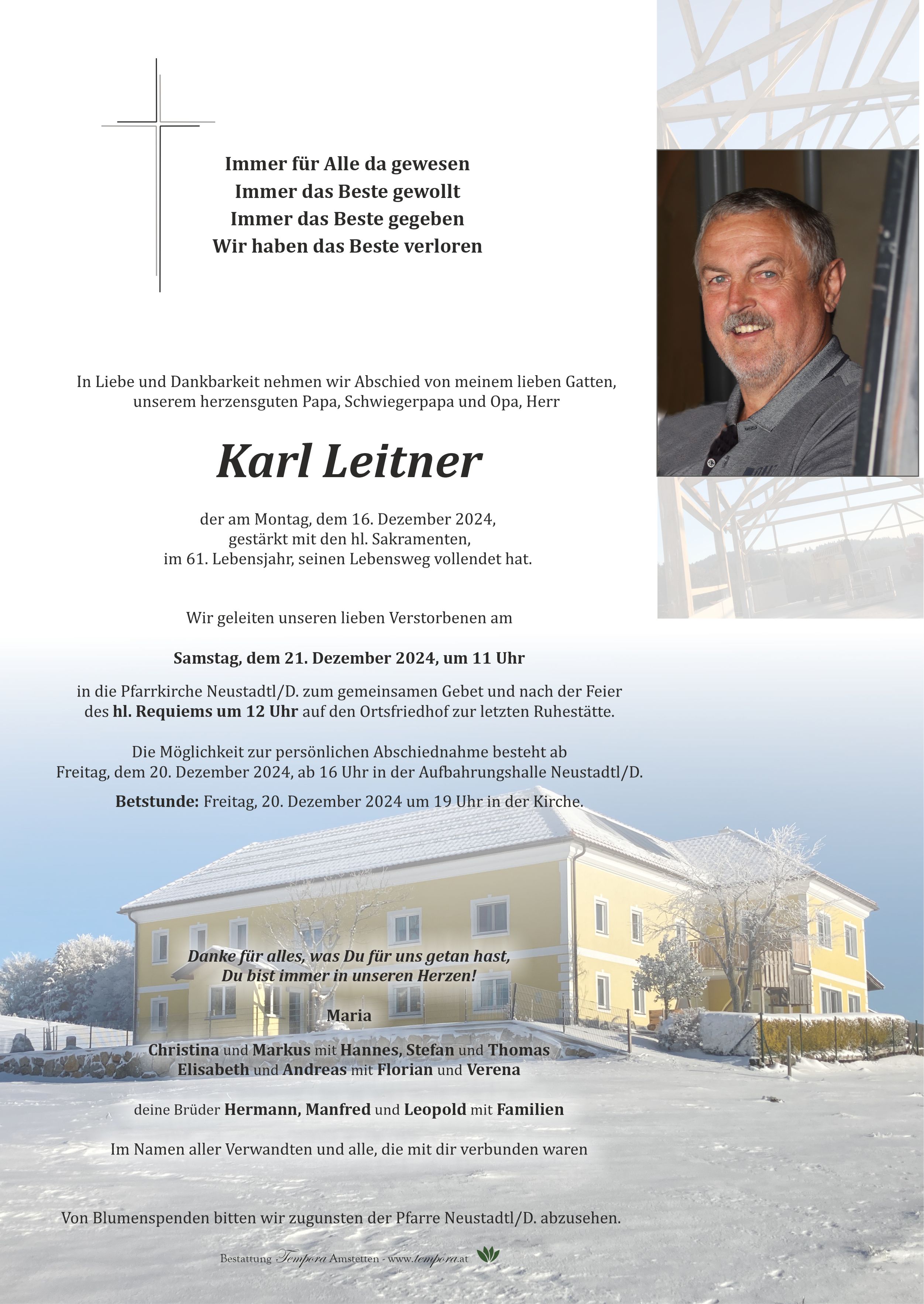 Karl Leitner, verst. 16.12.2024 im 61. Lebensjahr - Parte