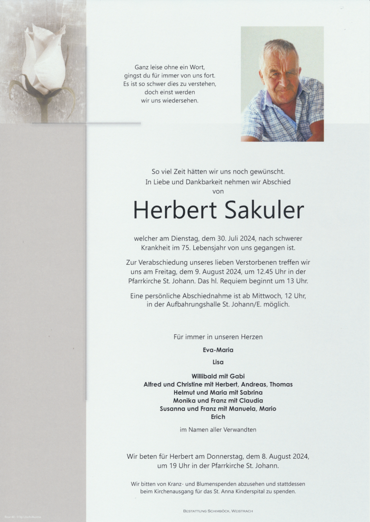 Herbert Sakuler, verst. 30.07.2024 im 75. Lebensjahr - Parte