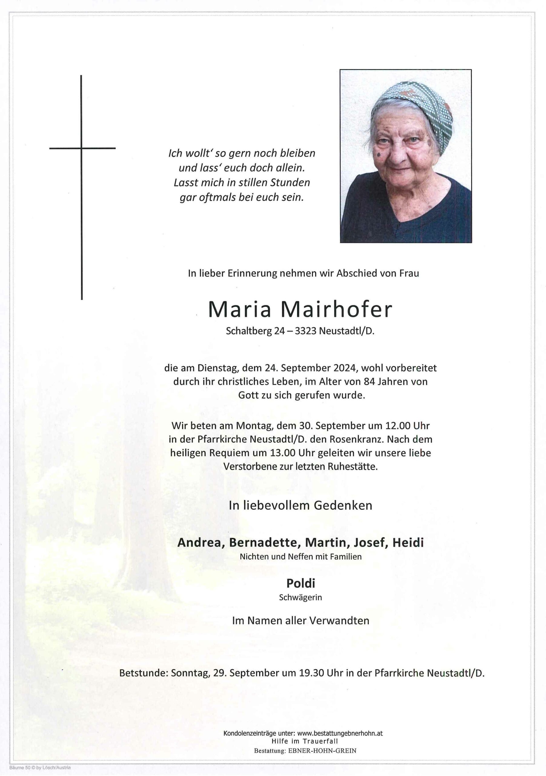 Maria Mairhofer, verst. 24.09.2024 im 84. Lebensjahr - Parte