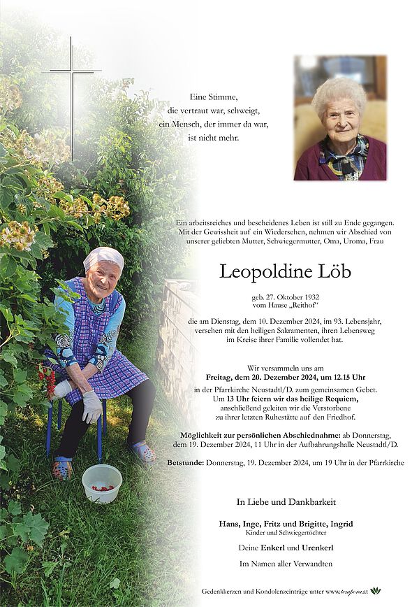 Leopoldine Löb, verst. 10.12.2024 im 93. Lebensjahr - Parte