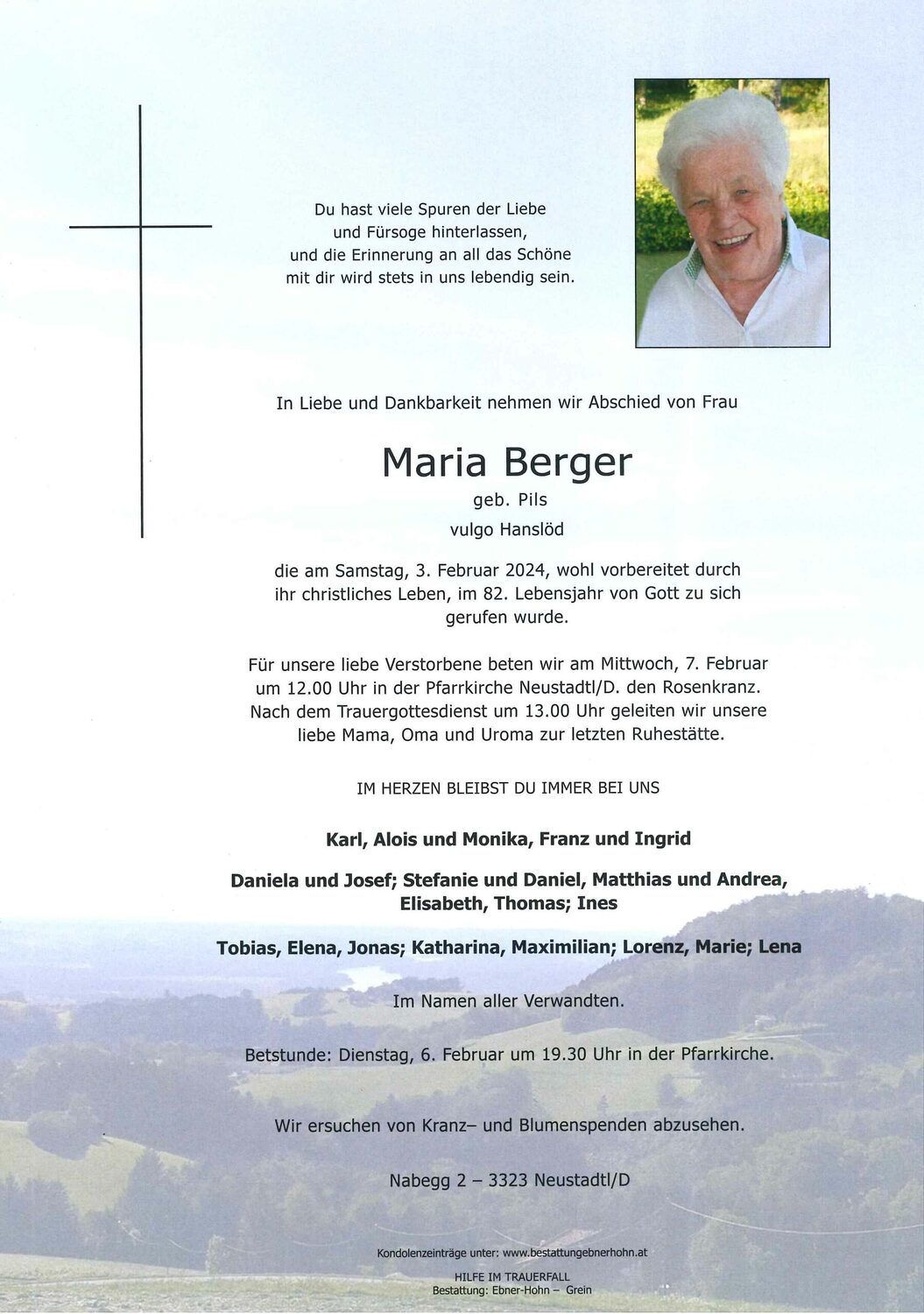 Maria Berger, verst. 03.02.2024 im 82. Lebensjahr - Parte