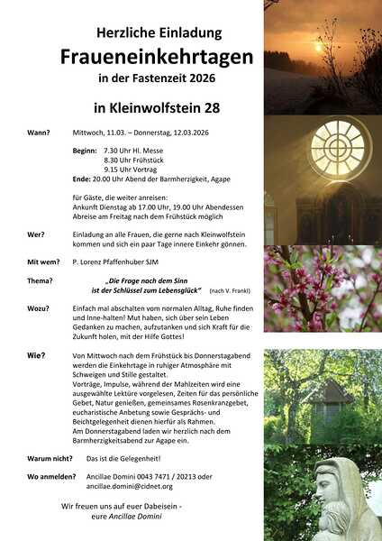 Herzliche Einladung zu den Fraueneinkehrtagen in der Fastenzeit 2026 Von Mittwoch, 11.03.2026 bis Donnerstag 12.03.2026 Beginn: 7:30 Uhr Hl. Messe Ende: 20:00 Uhr Abend der Barmherzigkeit, Agape mehr: Fraueneinkehrtagen in der Fastenzeit 2026