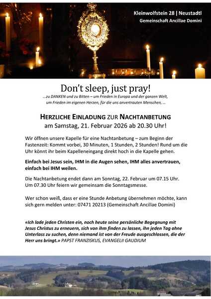Herzliche Einladung zur Nachtanbetung Don't sleep, just pray! Herzliche Einladung zur Nachtanbetung am Samstag, 21.02.2026 ab 20:30 Uhr. mehr: Don't sleep, just pray!