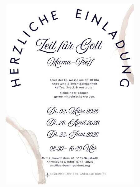 Herzliche Einladung Zeit für Gott - Mama-Treff Termine: Dienstag, 03.03.2026 Dienstag, 28.04.2026 Dienstag, 23.06.2026 jeweils von 8:30 Uhr bis 10:30 Uhr mehr: Zeit für Gott - Mama-Treff
