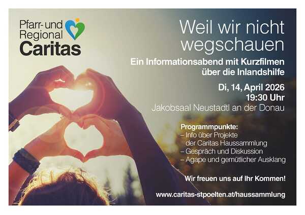 Caritas Weil wir nicht wegschauen Informationsabend mit Kurzfilmen über die Inlandshilfe am Dienstag, 14.04.2026 um 19:30 Uhr im Jakobsaal Neustadtl an der Donau. mehr: Weil wir nicht wegschauen