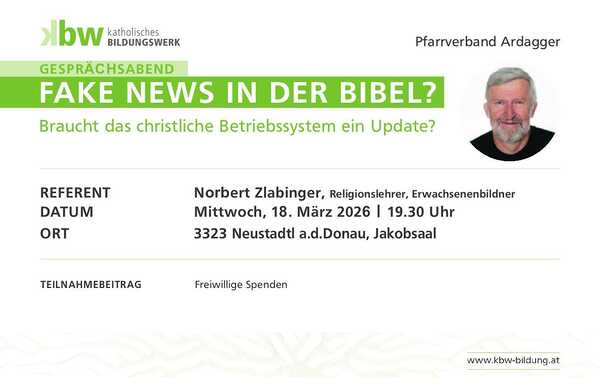 Katholisches Bildungswerk Gesprächsabend: Fake News in der Bibel? Herzliche Einladung zum Gesprächsabend zum Thema "Fake News in der Bibel? Braucht das christliche Betriebssystem ein Update?" mehr: Gesprächsabend: Fake News in der Bibel?