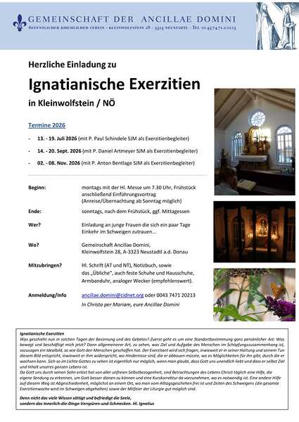 Herzliche Einladung zu Ignatianische Exerzitien in Kleinwolfstein Termine 2026: 13.07. - 19.07.2026 14.09. - 20.09.2026 02.11. - 08.11.2026 mehr: Ignatianische Exerzitien in Kleinwolfstein