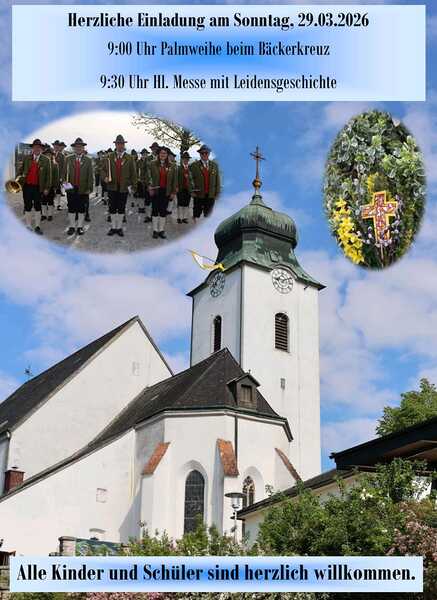zur Palmprozession am 29.03.2026 um 9:00 Uhr Herzliche Einladung Herzliche Einladung zur Palmprozession am 29.03.2026 9:00 Uhr beim Bäckerkreuz 9:30 Uhr Hl. Messe mit Leidensgeschichte mehr: Herzliche Einladung